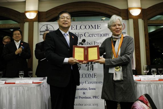 10月20日晚,艾奥瓦州马斯卡廷市市长霍普金斯为代表团举行欢迎晚宴。我会谢元副会长在晚宴中致辞,并向萨拉·兰蒂女士授予“人民友好使者”称号,以表彰她多年来为促进中美两国人民交往和友谊所做的积极努力和贡献。兰蒂女士曾于1986-1998年先后担任艾州友好省州委员会主席和执行主任,曾多次到访中国,为促进艾州与中国,特别是与河北省在教育、农业、医疗和文化等领域的友好交往倾注了大量热情和心血。