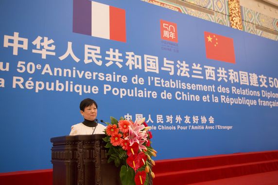 张德江在致辞中表示,50年前的今天,中法两国政府宣布建立大使级外交关系。这是中法两国人民交往史上具有里程碑意义的重大历史事件。中法建交开启了两个伟大国家友好关系的新纪元,树立了不同社会制度国家和平共处的新典范,对国际战略格局产生了重大而深远的影响。