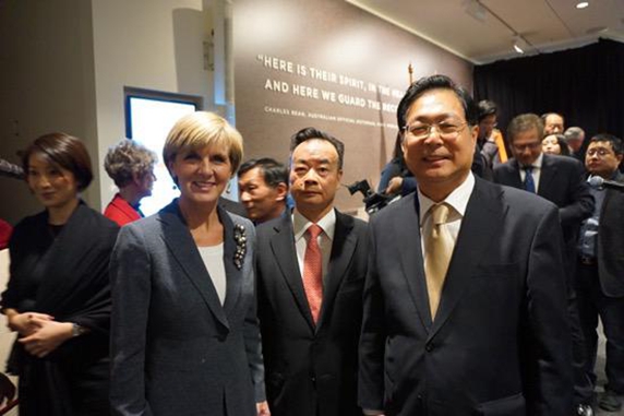 澳大利亚外交部长毕晓普在致辞时说,澳中两国人民交往源远流长,为澳州多元文化注入了宝贵活力。华裔军人在战争中流血牺牲,为澳州乃至世界和平作出了不可磨灭的贡献。