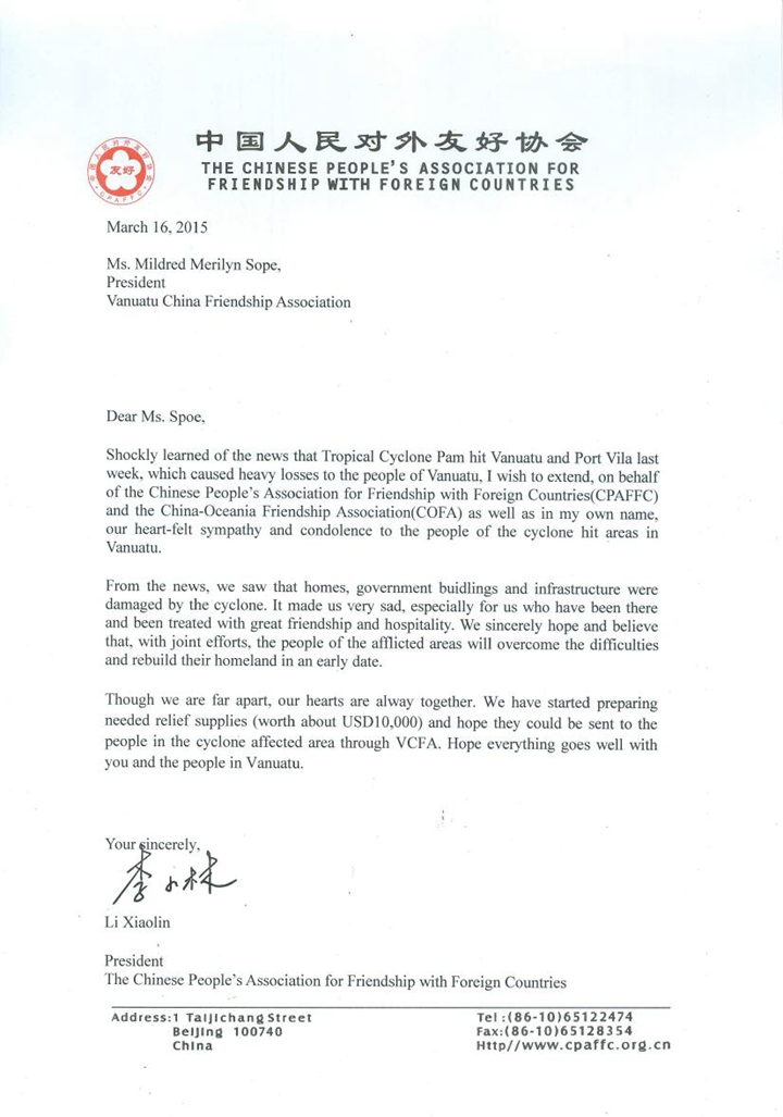 收到消息后,李小林会长代表188bet亚洲及中国大洋洲友好协会致信瓦努阿图中国友好协会主席索佩夫人,向瓦受灾地区人民表示慰问,同时表示我会将尽快通过瓦中友协向灾区人民寄送价值约1万美元的救灾物资。
