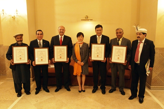 The Awarding Ceremony of “Five Principles of Peaceful Coexistence Friendship Award” was held in Islamabad, Pakistan on April 20, 2015. Visiting Chinese President Xi Jinping and Pakistani President Mamnoon Hussain attended the awarding ceremony. CPAFFC President Li Xiaolin presided over the ceremony. President Xi Jinping conferred the Five Principles of Peaceful Coexistence Friendship Award on the following groups and individuals for their long-term commitment to China-Pakistan friendship. They are All Pakistan China Friendship Association, the National University of Modern Languages, the National Management College and Earthquake Medical Relief Mission China-2008. Mushahid Hussain Sayed, Ali Ahmad Jan and Masood Khan were also granted the award.