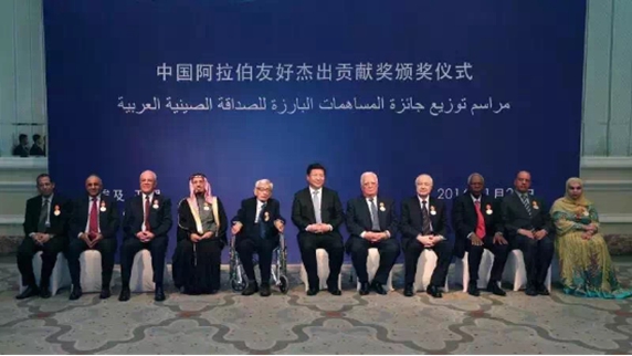 Visiting Chinese President Xi Jinping met with former United Nations Secretary General Boutros Ghali and other 9 Arab friendship individuals in Cairo of Egypt on January 20, who were conferred on the China-Arab Friendship Outstanding Contribution Award by CPAFFC President Li Xiaolin.