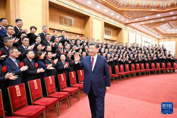 上午11时30分许,习近平等来到人民大会堂东大厅,全场响起热烈掌声。习近平等向代表们挥手致意,同大家亲切交流并合影留念。