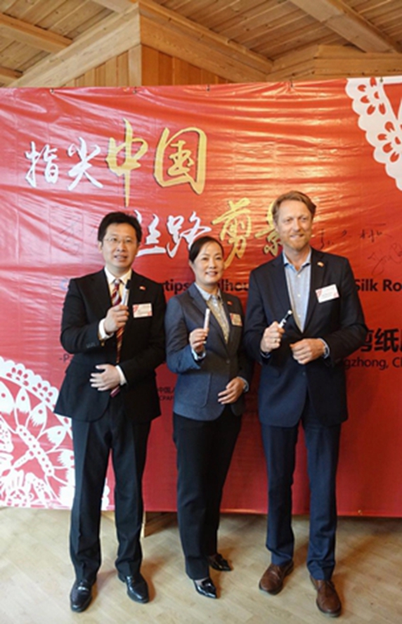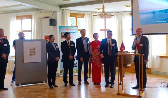 我会文交部副主任季伟、扬中市副市长孙冬梅和斯塔万格市商务署长赫恩斯为展览揭幕